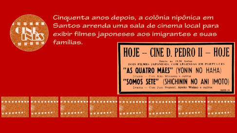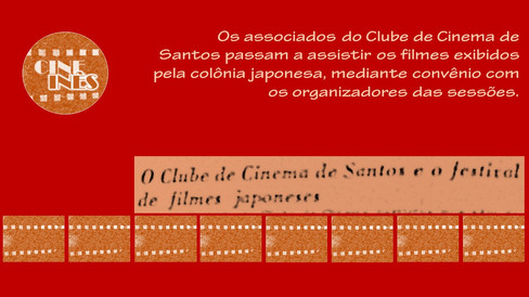 Conteúdo ilustrado sobre as sessões de cinema em japonês em Santos, e o envolvimento do Clube de Cinema nas programações.